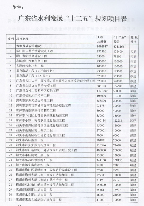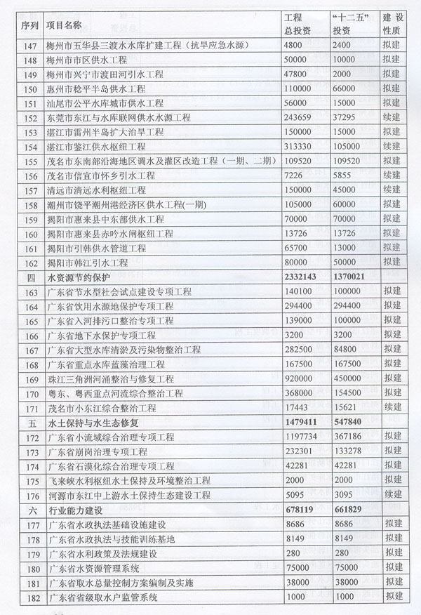 ? 印發廣東省水利發展“十二五”規劃的通知 ? 各地級以上市人民政府,各縣(市、區)人民政府,省政府各部門、各直屬機構: 《廣東省水利發展“十二五”規劃》已經省人民政府同意,現印發給你們,請認真貫徹實施。實施中遇到的問題,請徑向省水利廳、發展改革委反映。 ? ? ? ? 廣東省人民政府辦公廳二○一一年十二月二十九日 ? ? ? 廣東省水利發展“十二五”規劃 ? ? ? ? 目 錄 ? 一、現狀與形勢 …………………………………………………………(1) (一)“十一五”時期廣東水利發展成效顯著…………………………(1) (二)“十二五”時期廣東水利發展形勢………………………………(2) 1.廣東水利跨越式發展面臨的挑戰 ……………………………………(2) 2.廣東水利發展進入重要戰略機遇期 …………………………………(3) 二、指導思想、基本原則和規劃目標……………………………………(3) (一)指導思想……………………………………………………………(3) (二)基本原則……………………………………………………………(4) (三)規劃目標……………………………………………………………(5) 三、主要任務………………………………………………………………(6) (一)完善農村水利基礎設施……………………………………………(6) 1.突出加強農田水利建設 ………………………………………………(6) 2.繼續推進農村飲水安全工程 …………………………………………(6) 3.開展農村重點易澇區整治 ……………………………………………(7) 4.加強農村水電與電氣化建 ……………………………………………(7) 5.推進水庫移民安居工程建設 …………………………………………(7) (二)加強防洪體系建設…………………………………………………(7) 1.完善主要江河防洪體系 ………………………………………………(7) 2.加強中小河流治理 ……………………………………………………(8) 3.加快推進“千里海堤加固達標工程” ………………………………(8) 4.繼續實施病險水庫水閘除險加固工程 ………………………………(8) 5.強化山洪災害防治 ……………………………………………………(9) 6.強化非工程措施建 ……………………………………………………(9) (三)優化水資源配………………………………………………………(9) 1.加快建設水利樞紐及河庫水系連通工程 ……………………………(9) 2.加快建設調引提蓄水工程 ……………………………………………(10) 3.加快推進應急備用水源及非常規水源建設 …………………………(10) (四)加強水資源保護與節約……………………………………………(10) 1.加強重點飲用水水源地保護 …………………………………………(10) 2.加強水庫水資源保護 …………………………………………………(11) 3.加大地下水保護力度 …………………………………………………(11) 4.加強重點河道(涌)整治 ……………………………………………(11) 5.加強水土保持與生態修復 ……………………………………………(11) 6.全面推進節水型社會建設 ……………………………………………(11) (五)實行最嚴格水資源管理制度………………………………………(12) 1.建立用水總量控制制度 ………………………………………………(12) 2.建立用水效率控制制度 ………………………………………………(12) 3.建立水功能區限制納污制度 …………………………………………(13) (六)深化水利體制機制改革……………………………………………(13) 1.深化水管體制改革 ……………………………………………………(13) 2.加強水利法制建設 ……………………………………………………(13) 3.大力提升水利行業能力 ………………………………………………(13) 4.提高水利應急管理能力 ………………………………………………(14) 5.強化水行政執法能力 …………………………………………………(14) 6.推動水文化建設 ………………………………………………………(15) 四、保障措施………………………………………………………………(15) (一)加強組織領導………………………………………………………(15) (二)加大資金投入………………………………………………………(15) (三)科學制訂規劃………………………………………………………(15) (四)加強隊伍建設………………………………………………………(16) (五)強化監督檢查………………………………………………………(16) (六)重視環境保護………………………………………………………(16) 附件:廣東省水利發展“十二五”規劃項目表…………………………(18) ? ? ? 加快水利改革發展事關農業農村發展,事關防洪安全、供水安全、糧食安全和生態安全,事關經濟社會發展全局。根據中央水利工作會議、《中共中央國務院關于加快水利改革發展的決定》(中發〔2011〕1號)和省水利工作會議、《中共廣東省委廣東省人民政府關于加快我省水利改革發展的決定》(粵發〔2011〕9號)以及《廣東省國民經濟和社會發展第十二個五年規劃綱要》精神,制定本規劃。 一、現狀與形勢 (一)“十一五”時期廣東水利發展成效顯著。 省委、省政府高度重視水利工作,帶領全省人民積