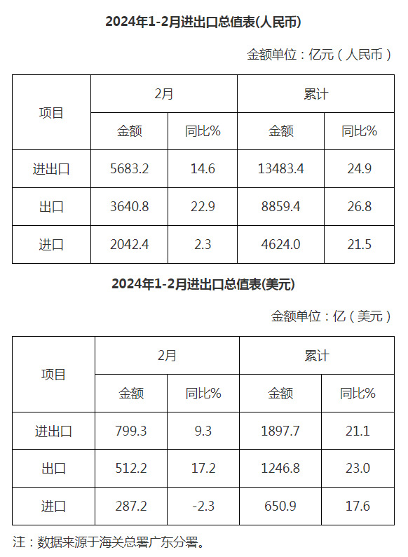 廣東省外貿(mào)進(jìn)出口總值表(2024年1-2月)