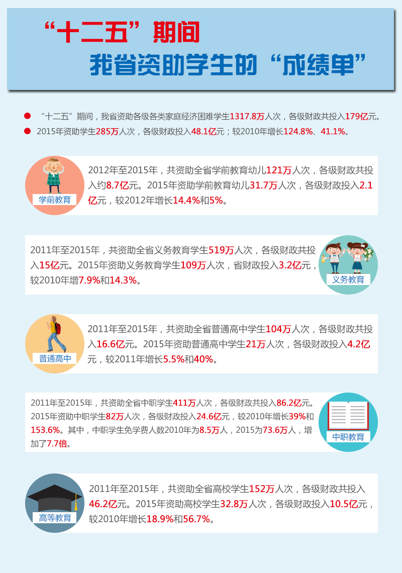 省教育廳有關負責人說,“十二五”期間,我省不斷擴大資助對象的范圍,不斷提高資助標準,學生資助工作推進力度最大,取得長足發展的時期,總共資助各級各類學生1317.8萬名,資助金額179億元。其中,學前教育階段8.7億元,受惠兒童約121萬人。義務教育階段15.1億元,受助學生約520萬。高中教育階段103億元,受助學生約515萬人。本專科教育階段46.2億元,獎助學生152萬人。研究生教育階段6億元,獎助學生約10萬人。