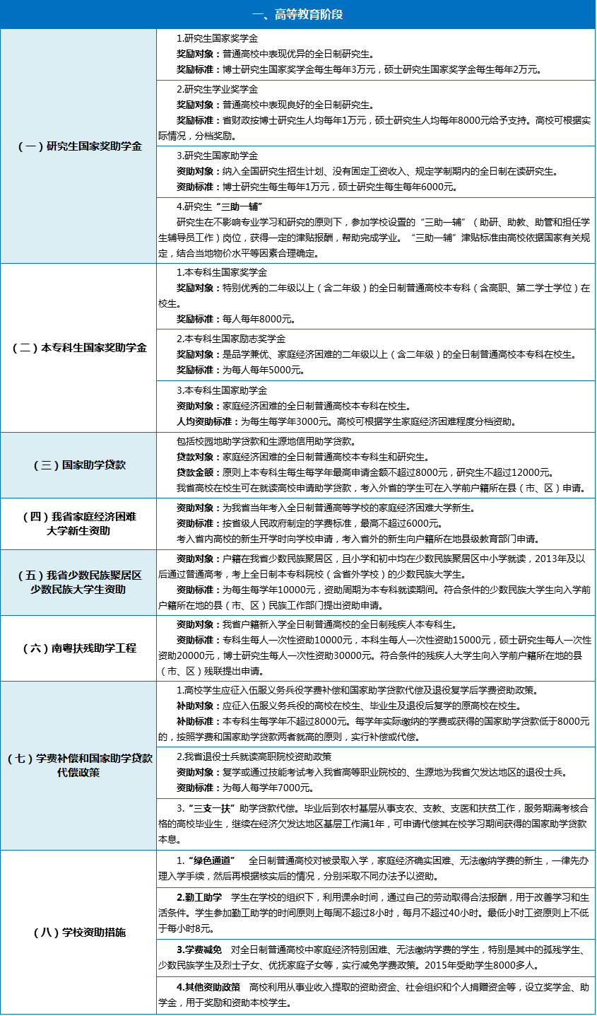 目前,我省形成了以政府投入為主、高校落實責任、社會積極參與三方共同支持的多維度多渠道的資助體系,建立了以國家獎學金、國家勵志獎學金、國家助學金、國家助學貸款為主,勤工助學、學費減免、社會資助、學費補償、助學貸款代償和確保家庭經濟困難學生順利入學的“綠色通道”制度等有機結合的資助政策體系。同時,結合我省省情,制定了“廣東特色”的專項資助政策,即貧困家庭大學新生入學資助、少數民族聚居區少數民族大學生資助和南粵扶殘助學工程。